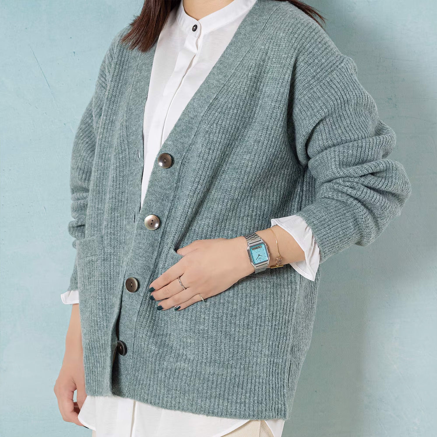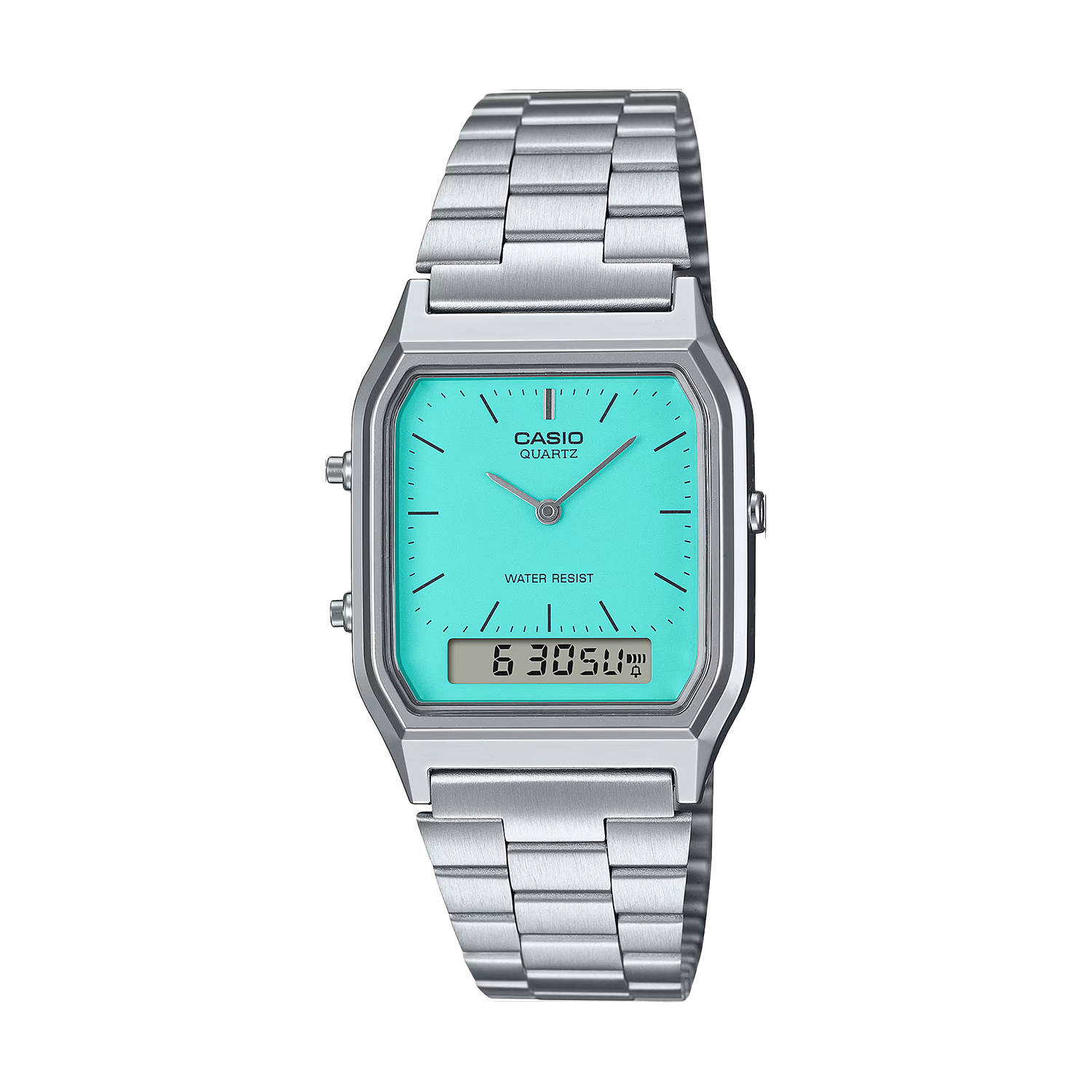 Charmant klassisch, trendig bunt. Das eckige Gehäuse umrahmt ein Zifferblatt, das den neuesten Farbtrends folgt. Retro-Einfachheit trifft auf moderne Funktionalität in einer analogen Uhr mit kleinem digitalen Fenster für nützliche Infos auf Knopfdruck. Ein vielseitiges, elegantes Design für jeden Anlass, von formellen Veranstaltungen bis hin zu legeren Treffen.
