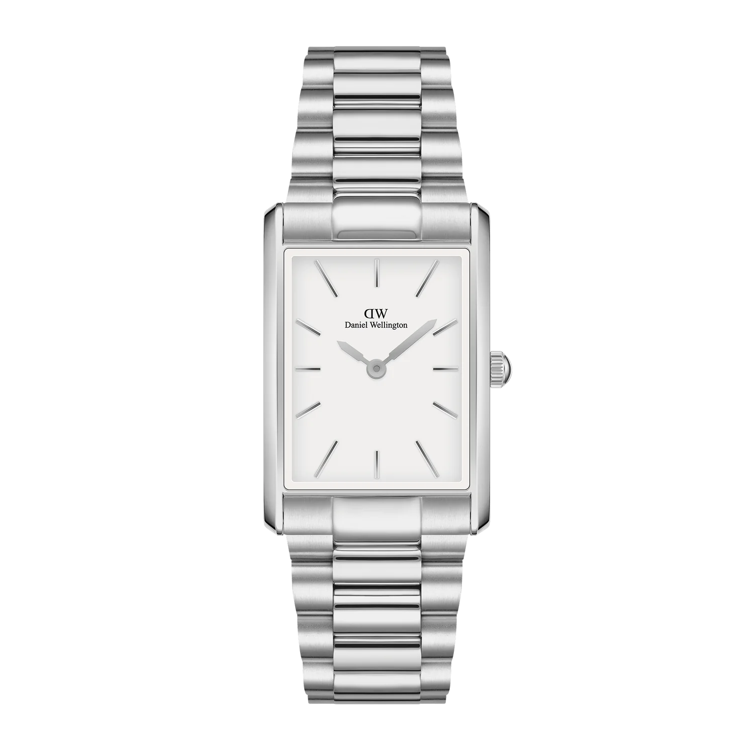 Mit schlanken geometrischen Kanten und in zwei Größen zur Auswahl bringt unsere Bound Kollektion die perfekte Symmetrie an dein Handgelenk. Das geschwungene rechteckige Gehäuse dieser Uhr in Silber passt exakt zur Breite des 3-gliedrigen Armbands — und sorgt für ein nahtlos integriertes Zifferblatt.