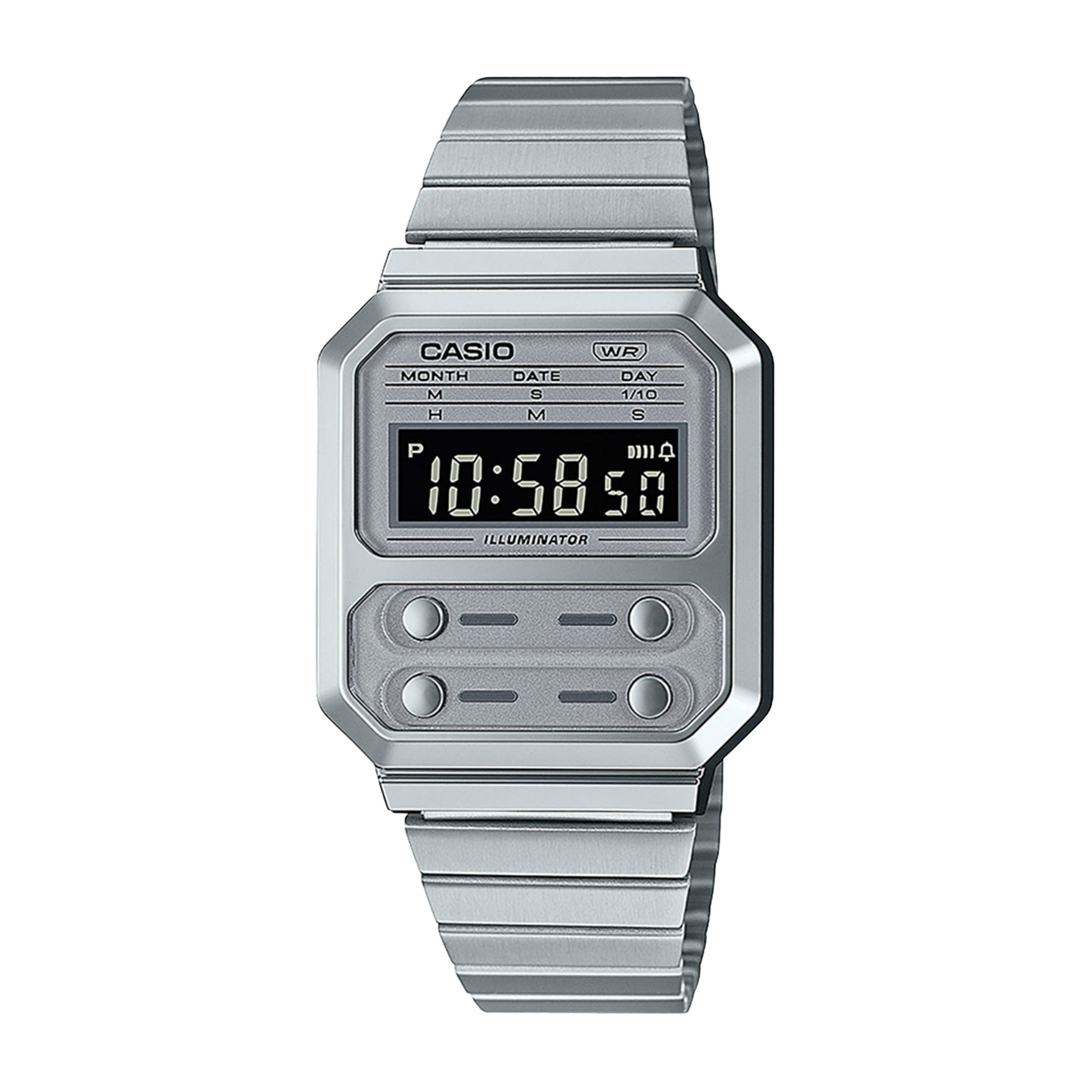 Als Hommage an die F-100, die erste Casio Uhr mit einem Gehäuse aus Kunstharz, erinnert die A-100 Linie an die ikonischen vier Knöpfe auf der Vorderseite und fügt Metallkomponenten im Vintage-Stil hinzu, um einen echten Klassiker neu zu interpretieren. Dieser Zeitmesser ist zwar Retro im Stil, aber trotzdem modern in der Funktionalität und ausgestattet mit Stoppuhr, Kalender, wasserdichtem Gehäuse für den täglichen Gebrauch und natürlich LED-Leuchten für leichtes Ablesen bei allen Lichtverhältnissen.
