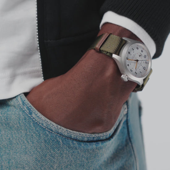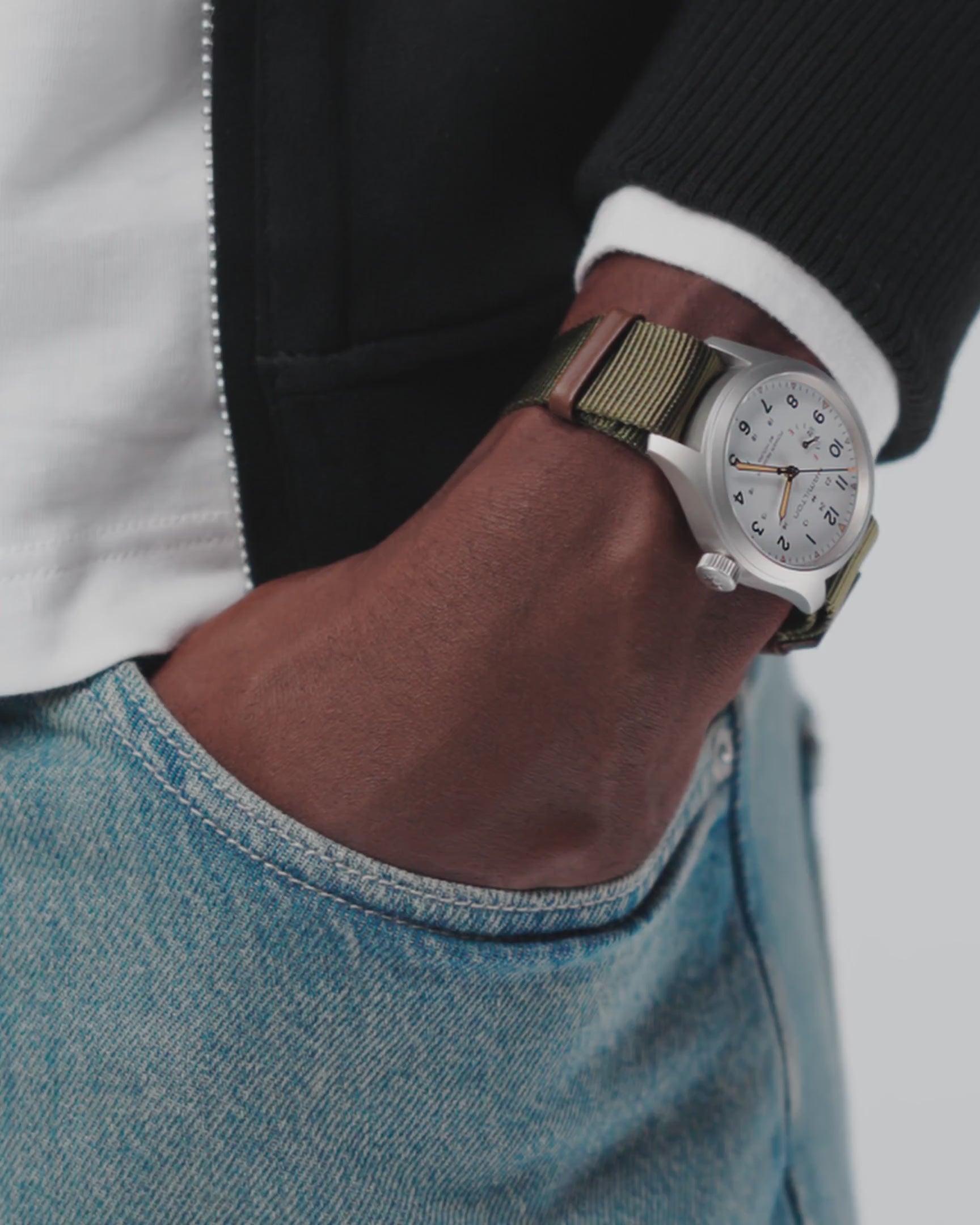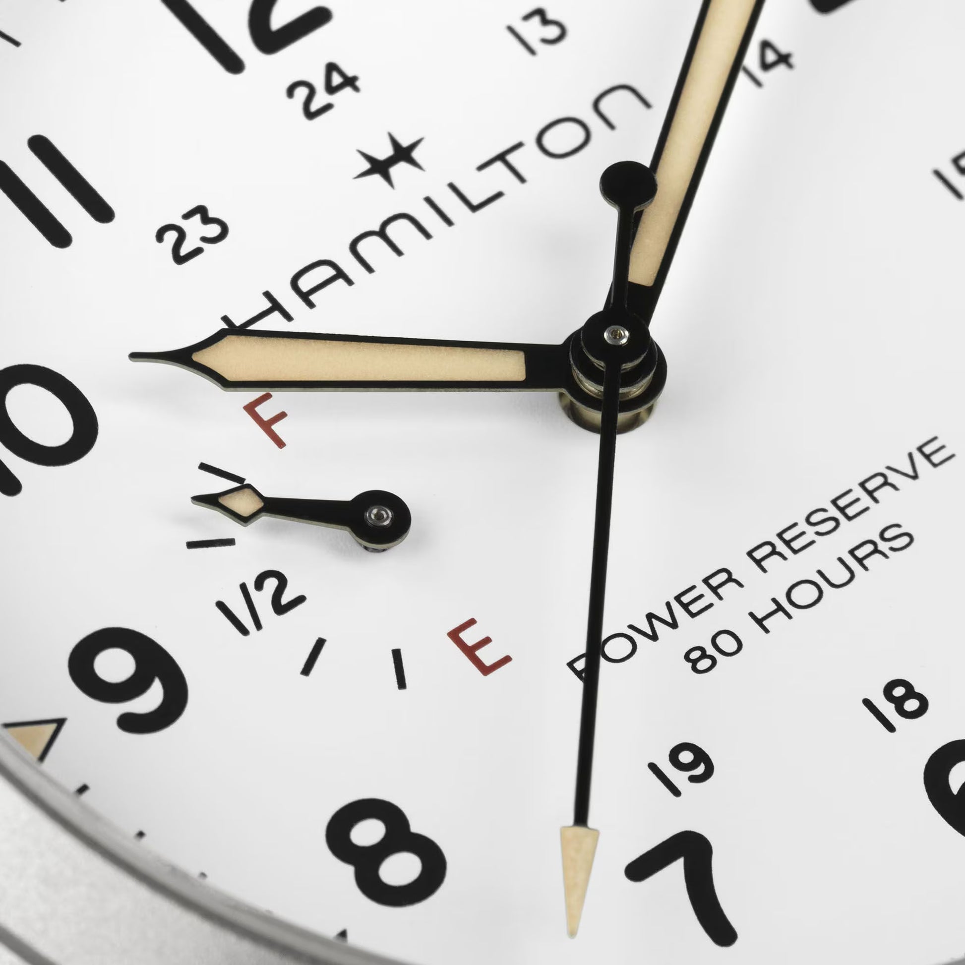 Die Khaki Field Mechanical Power Reserve 40mm ist eine Hommage an das traditionelle Design und die unverzichtbare Funktionalität der Khaki-Familie und präsentiert gleichzeitig moderne Funktionen sowie die neuesten Technologien und Innovationen der Uhrmacherkunst.
