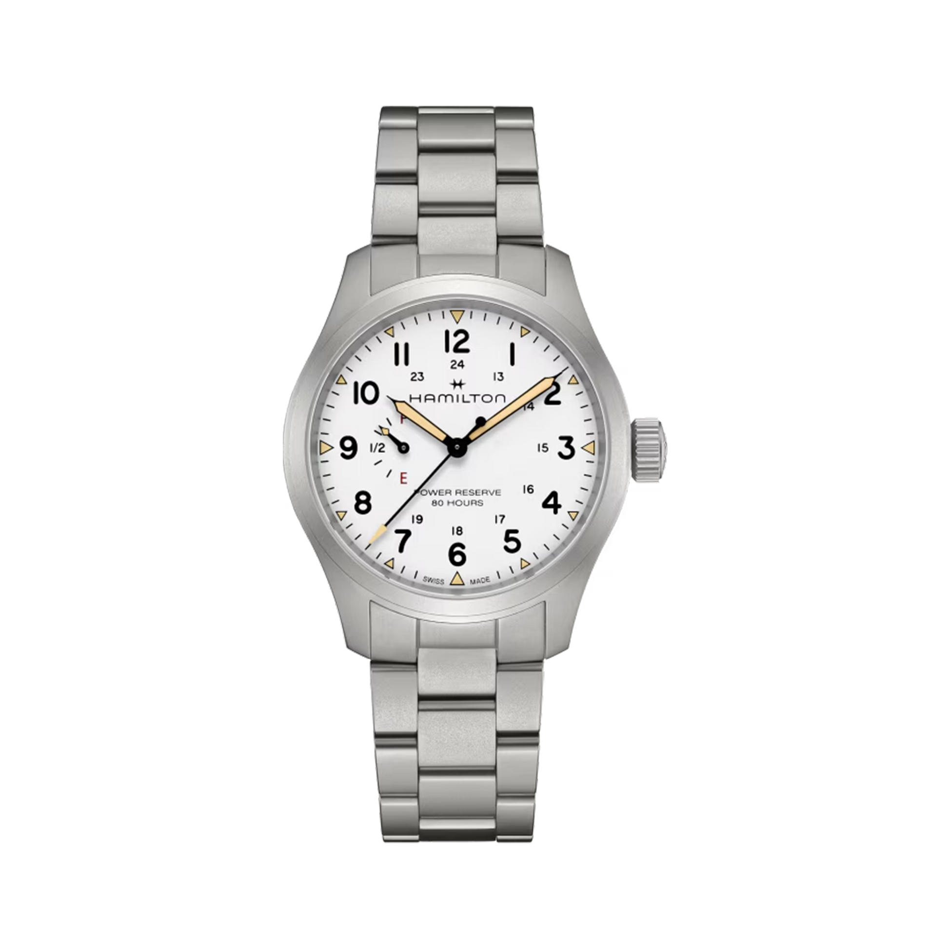 Die Khaki Field Mechanical Power Reserve 40mm ist eine Hommage an das traditionelle Design und die unverzichtbare Funktionalität der Khaki-Familie und präsentiert gleichzeitig moderne Funktionen sowie die neuesten Technologien und Innovationen der Uhrmacherkunst.