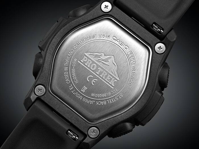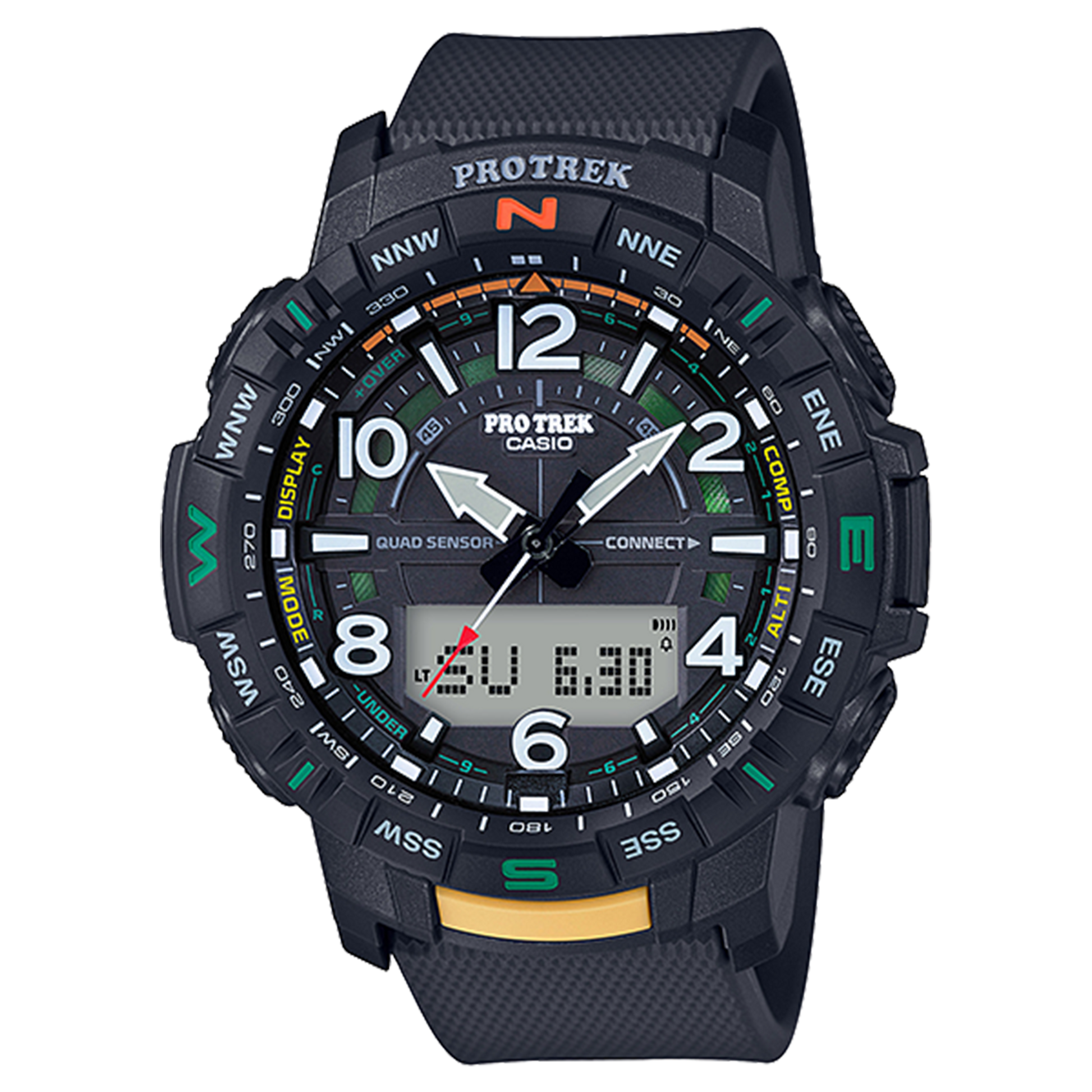 Dieses Modell von PRO TREK lässt sich über Bluetooth® mit der eigenen App "CASIO WATCHES“ verbinden und verbessert so die Benutzerfreundlichkeit im Freien. Mit vierfachem Sensor zur Messung der Anzahl der Schritte, der Richtung, der Höhe über dem Meeresspiegel/des Luftdrucks sowie der Temperatur. Speichert von der Uhr gemessenen Kalorienverbrauch und Höhenangaben sowie über das Smartphone-GPS erfasste Routen in der App. Dank einer Vereinfachung verschiedener Einstellungen ist die automatische Zeiteinstellung weltweit verfügbar. Ebenfalls automatisch lassen sich der Höhenmesser korrigieren und die Zeiten für Sonnenaufgang und Sonnenuntergang berechnen. Ermöglicht auch die Aktivierung und Deaktivierung verschiedener Modi und die individuelle Anpassung durch die Auswahl verschiedener Displays in der App. Der feine Harzüberzug auf der Rückseite fügt sich dank seiner Struktur perfekt mit den Ösen zusammen. Sowohl die Tastenschutzvorrichtung als auch das Gehäuse sind noch widerstandsfähiger. Das breite Ziffernblatt mit seinen arabischen Ziffern lässt sich bestens erkennen und ablesen. Die Richtungsanzeige besteht aus Metallteilen. Typische Outdoor-Farben sorgen hier für besondere Akzente. Darüber hinaus zeichnet sich die gesamte Oberfläche des Urethan-Armbandes durch eine 3D-Struktur aus, die dafür sorgt, dass die Schnalle des Armbands nicht rutscht und die Uhr sich so in Outdoor-Situationen besser tragen lässt.
