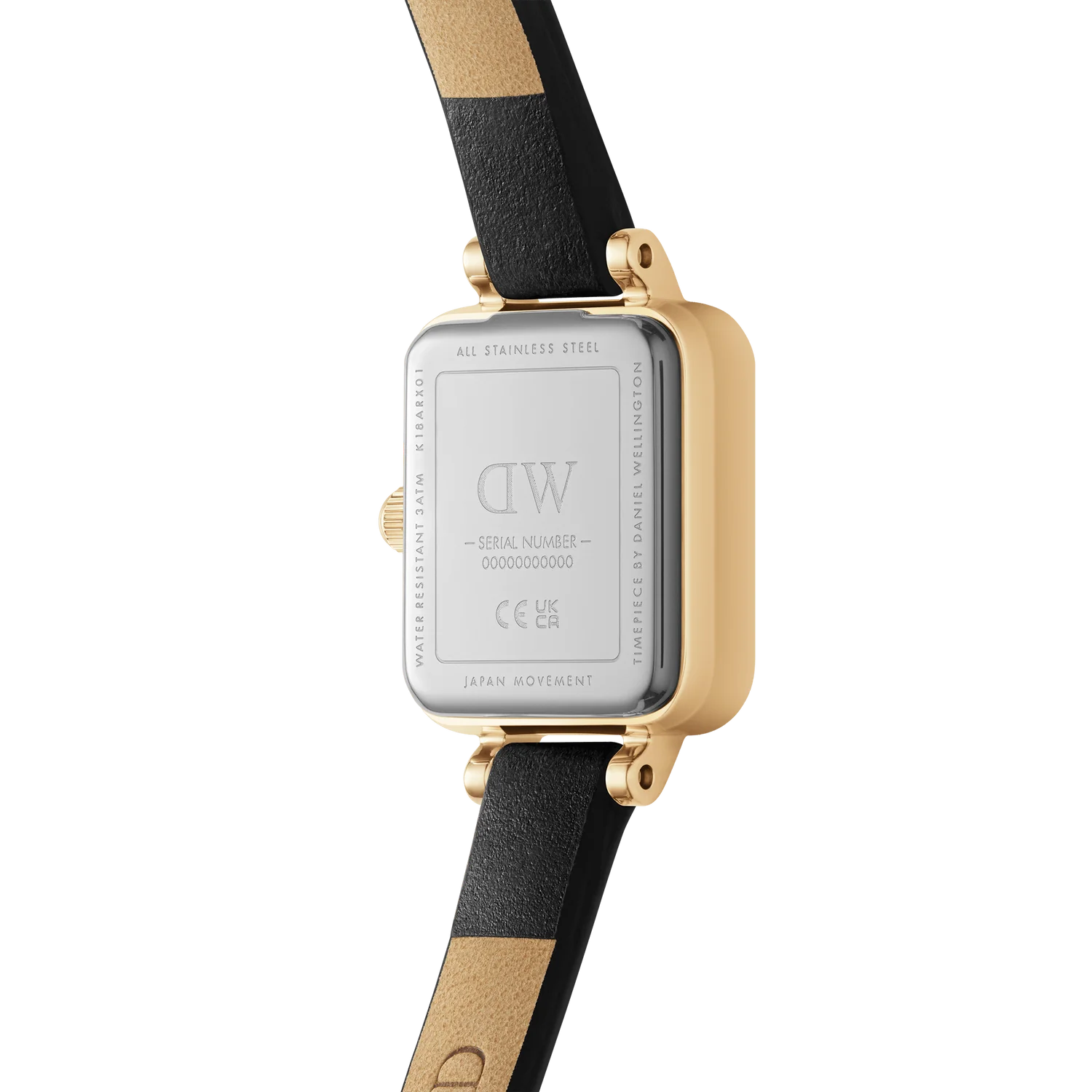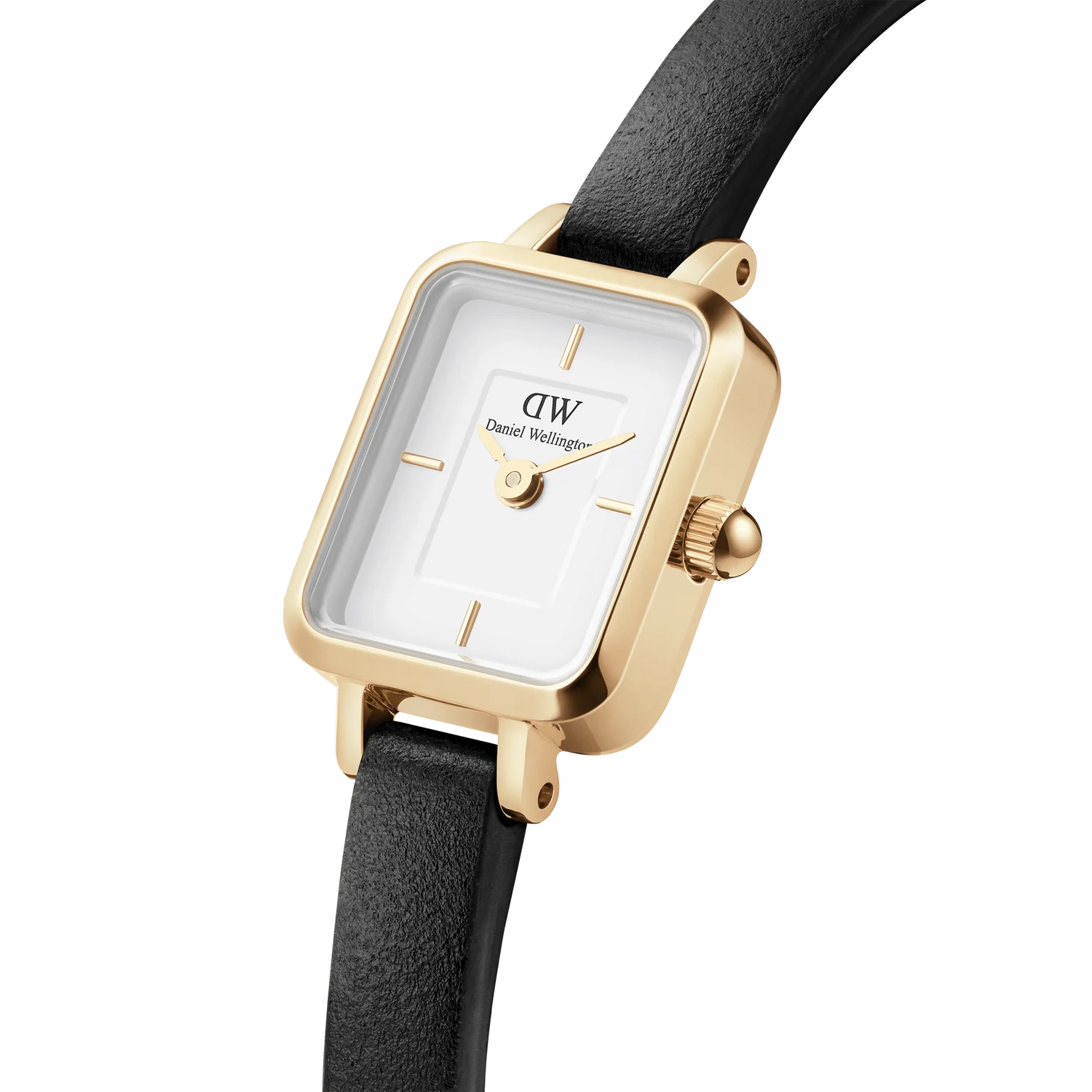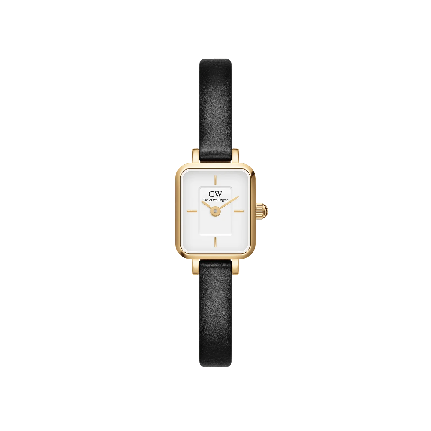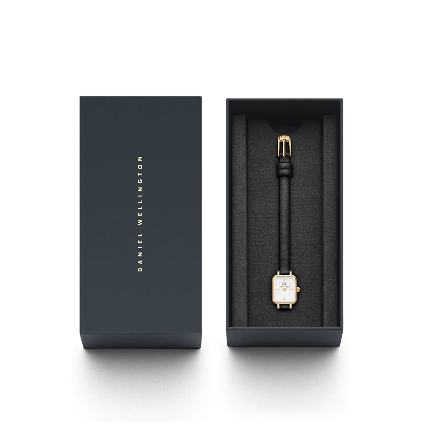 Die coole Formgebung der Quadro, minimiert zu unserer kleinsten Uhr ever. Die Gold-Version der Quadro Mini hat ein austauschbares schwarzes Armband aus italienischem Echtleder.