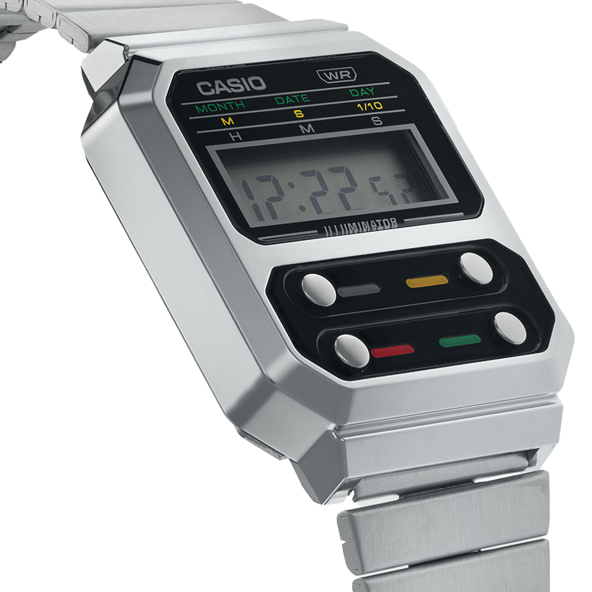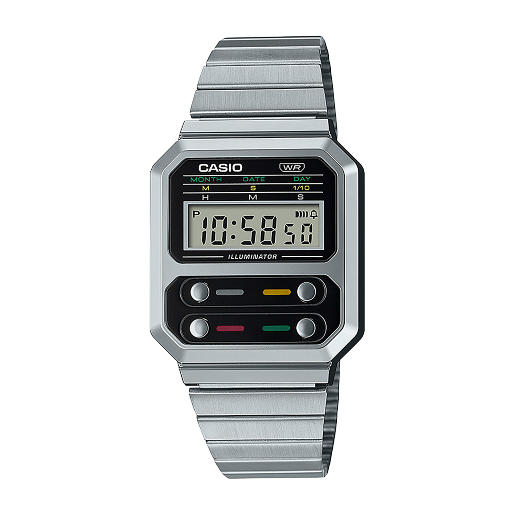 Die A100-Linie ist eine Hommage an die F-100, die erste Casio-Uhr mit einem Harzgehäuse. Wir haben das legendäre Layout mit den vier Tasten auf der Vorderseite beibehalten, aber Metallkomponenten im Vintage-Stil eingeführt, um diesen echten Klassiker neu zu erfinden. Diese Zeitmesser sind zwar Retro im Stil, aber trotzdem modern in der Funktionalität und ausgestattet mit Stoppuhr, Kalender, wasserdichtem Gehäuse für den täglichen Gebrauch und natürlich LED-Leuchten für leichtes Ablesen bei allen Lichtverhältnissen. Mit dem Schiebverschluss kannst du die Bandlänge für eine perfekte Passform ganz einfach anpassen.